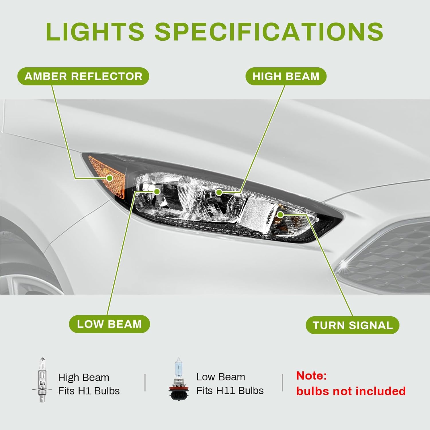| Light Source | High Beam:H1/Low Beam:H11 (Halogen bulbs aren't included) |