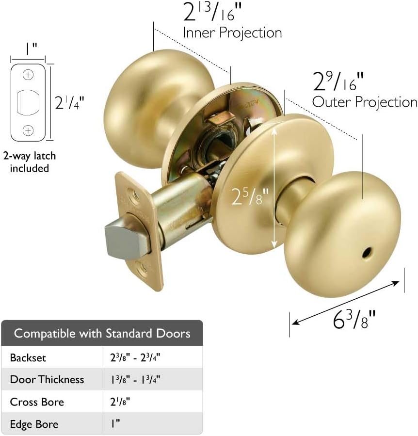 The Design House 726968 Cambridge Privacy Bed and Bath Knob adds a touch of elegance to any home decor. This lockset is reversible to fit left or right-hand doors and features a classic satin gold finish. Perfect for residential or business installation. This item fits 1-3/8 inches to 1-3/4 inches thick doors and has an adjustable 2-3/8 inches to 2-3/4 inches backset. This product is ANSI Grade-3 certified and rated for residential security. By installing the Design House Cambridge Privacy Lockset in your home, you gain a sense of security and comfort. Designed and manufactured by Design House, the trusted source for quality lighting, hardware, plumbing, kitchen, and bath products for every taste and budget.