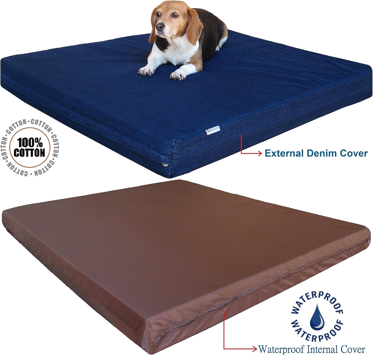 41" Length X 27" Width X 4" Thick in size is excellent for small to medium breed dogs or fit into 42"X28" large crate. The order comes with 2 Durable Denim cover in navy blue color on all side, 1 waterproof internal zippered cover and top graded 4 inches memory foam insert pad on this bed purchase. The extra 2nd bonus cover is a great replacement during the time you need to clean the original cover. Tired of changing your pet bed regularly? Those pet bed need to replace frequently because of the low cost fabric and cheap non memory foam or partial multi-layer glued memory foam being used. Dogbed4less offer the best material for Comfort, Support, Durability, Easy to clean and also Looks great in your house. Our pet bed products are made with high quality durable fabric and top rated memory foam to ensure the ultimate comfort and orthopedic support, which are rarely sold elsewhere due to the higher cost & weight. Our high density memory foam is 5 times denser and 4 times heavier than regular foams, which will not flatten overtime and provide many years of comfort & support under normal use. 2 excellent layers of fabric covers: Internal layer Taffeta waterproof fabric zipper cover to help secure the pad. The bed also comes with X2 durable 13 oz/yard jean denim fabric zipper cover (41"X27"X4" size) for easy cleaning and maintenance. Our external denim cover is 100% cotton made which is interchangeable for top or bottom side and great for pets that are allergic to synthetic fabrics. The external cover is machine washable and dry-able. DogBed4Less products are heavy duty and are a lot more practical when compared to others because of our premium orthopedic memory foam pad and reusable durable fabric with easy to maintain.
