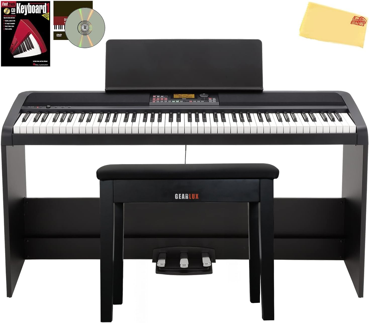 Adding value to your purchase, Austin Bazaar bundles your instrument with necessary accessories. Save yourself the hassle and save some money while you're at it. Bundle contains a stand and bench, so you can start playing right out of the box. An instructional booklet, cd, and dvd allows you to start learning right away. A dust cover and polishing cloth will keep your piano in mint condition. Everything you need to start playing immediately comes in one box!A digital piano with automatic accompaniment; a full concert performance experience at home.The XE20 is a new digital piano that features an 88-note natural-touch keyboard and contains two full concert grand pianos. It also includes automatic accompaniment so users can go from practicing their favorite songs to truly performing them at the touch of a button. A complete array of auto accompaniment Styles can be accessed with your left hand, giving you the backing of a full band that you control completely. Play chords, and XE20 will follow your changes in any Style you select. Change variations with a single touch. Add fills wherever you want. Add a melody with your right hand. It’s a completely live and in-the-moment way of performing!Keyboard: NH (Natural Weighted Hammer Action) Keyboard, 88 key (A0–C8)Touch Control: Four types, Soft (light), medium (standard), hard (heavier), fixedPitch: Transpose, Fine tuningSound Generation: Stereo PCMMaximum Polyphony: 184 voicesGerman piano and Italian piano: total maximum 120 voicesOther sounds: total maximum 64 vioicesSound: Over 705 sounds, 41 drum kits (including GM compatible sound set)Effects: Accompaniment part: 2 stereo digital multi-effects Keyboard part: 2 stereo digital multi-effectsStyle: 280 presets2 intro, 4 viriations, 2 Fills, 1 count in/break, 2 endings, syncro start/stop, tap tempoMusic Styles: Over 64 stylesDemo Songs: 21 songsAudio Player: MP3, WAV?44.1kHz, 16bi