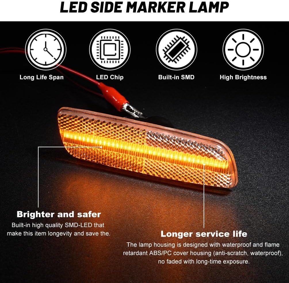 Product Name: NJSBYL Amber LED Side Marker Light Assemblies for 1998 - 2005 Lexvs GS300 GS400 GS430 IS300 LS400 Front Bumper Markers Lights Driving Running Singal Lamps Clear Lens OEM# 8173030110 8174030121 Direct Replace the Lexvs(Lexus)side marker lamps as below: 1. Compatible with 1998 1999 2000 LS400 2. Compatible with 1998 1999 2000 2001 2002 2003 2004 2005 GS300 3. Compatible with 1998 1999 2000 2001 2002 2003 2004 2005 GS400 4. Compatible with 1998 1999 2000 2001 2002 2003 2004 2005 GS500 4. Compatible with 2001 2002 2003 2004 2005 IS300 replaces OEM part # 81730-30110, 81731-30110, 81740-30120, 81741-30120 Features about these GS300 GS400 GS430 IS300 LS400 LED Side Marker Signal Light Assembly: - Style of the Lamps Housing: Clear Lens Style Lamps Housing! - Waterproof grade: Ip67 waterproof design. - Service life: Up to 50,000 hours - Amber LED side marker lights. - 300% brighter than original lights, super bright output, low power consumption. - Play and plug, direct fit, no modification needed, no additional resistors or relay required, easy to install. - This NJSBYL side marker lights lens is made of ABS/PC materials (anti-scratch, waterproof), no faded with long-time exposure. Package Includes: 2 Pieces LED Side Marker Running Lights Assemblies Please attention: 1. Manual measuring, please allow 1 ~ 3mm error, thank you. 2. Due to the difference between different monitors, the picture may not reflect the actual color of the item. We guarantee the style is the same as shown in the picture.