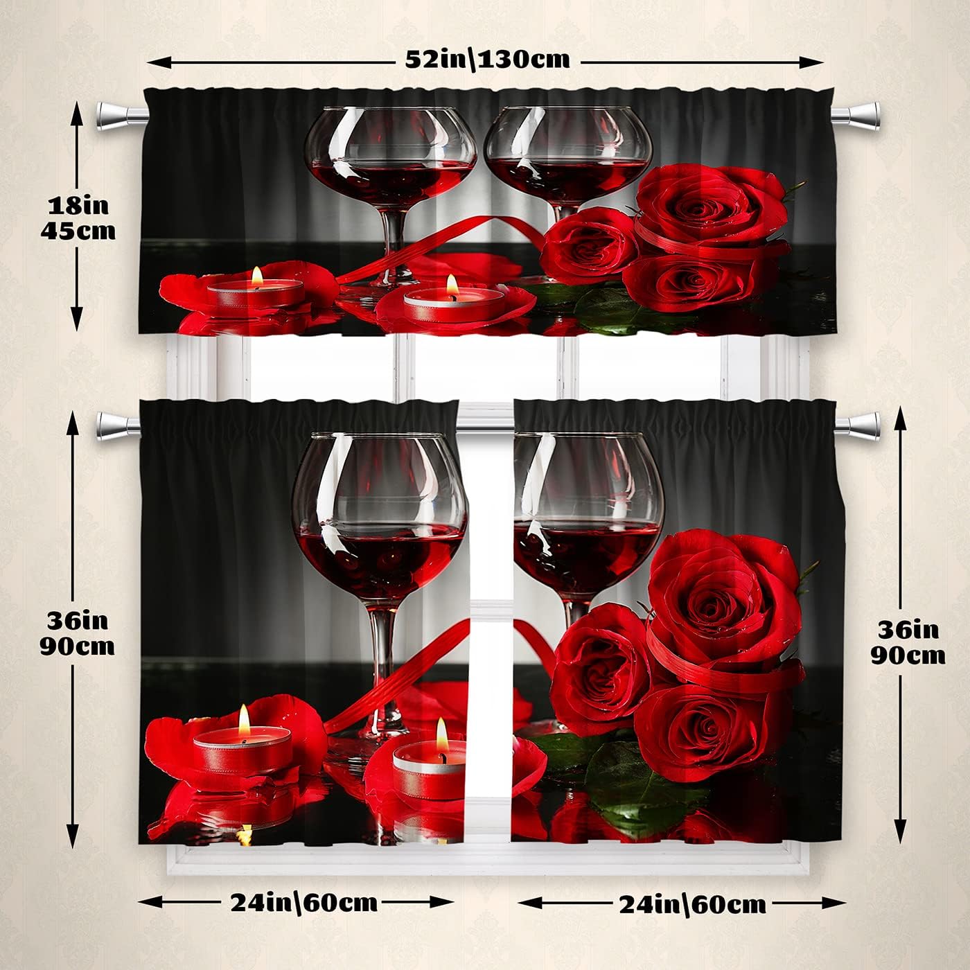 Kitchen Window Curtains and Valance Set ShadingTemperature BalanceSoft TouchMachine WashableRod PocketThe pattern of Kitchen Window Curtain Sets are very beautiful and unique, suitable for decorating most Windows in your home.Kitchen Curtains and Valance Set: 1 PC valance & 2 PCS tier curtains per packageValance Size: 52 x 18 Inches, Tier Size: 24 x 36 InchesMaterial: Blackout fabric. High density yarn have a better blackout effect.Perfect for kitchen, basement, bedroom, bathroom, living room, laundry room, studio and other windows.