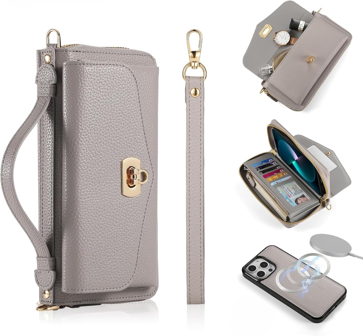 Elevate your iPhone 15 Pro Max/15 Pro/15 Plus/15 with the O N N A T wallet phone case, a perfect blend of style and functionality. Made from premium litchi pattern PU leather, this case exudes sophistication while providing all-round protection for your device. The detachable shockproof TPU case ensures your phone is safe from daily wear and tear, with raised edges to safeguard the camera and screen. Not just a phone case, but a complete wallet on the go, this accessory features a zip-around design with 14 RFID card slots to keep your essentials organized and secure. Three coin pockets provide space for loose change, while a built-in mirror comes in handy for quick touch-ups on the move. The magnetic ring allows for seamless wireless charging, making it convenient for your daily use. Designed with user convenience in mind, the O N N A T wallet case also comes with a detachable leather wrist and shoulder strap, offering versatile carrying options. Available in a range of elegant colors, this case is a perfect blend of style and functionality, catering to your everyday needs with ease. Upgrade your iPhone 15 series experience with the O N N A T wallet phone case - where style, protection, and convenience meet seamlessly. Material:PU+TPU+PC+Metal Package Include: 1 x Phone Case 1x Wrist Rope 1x Shoulder Strap Your Satisfaction is our Highest Priority, contact us first if you have any questions Thank You!