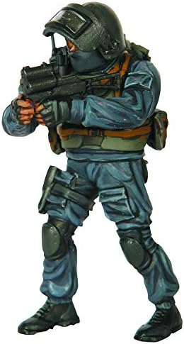 Vimpel' Russian Antiterrorist Unit. 6 detailed unassembled special forces soldiers, 3 with automatic weapons, 1 each with sniper rifle, heavy grenade launcher and light grenade launcher. Includes clear injection-molded face shields. Decals for shield insignia and mirror face.